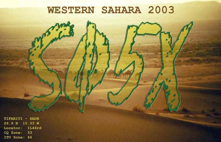 SØ5X Western Sahara Multi Internacional DX pedition 2003 Este ano algumas expedições marcaram sem duvida a actividade de DX, algumas entidades cairam do "ranking" dos "Most wanted" é o caso do WESTERN SAHARA que baixou a tabela dos 100 mais procurados. O sucesso des Expedição foi de tal maneira tão elevado que é considerada uma das candidatas á nomeação da Expedição do Ano 2003. Formada por uma equipe representado 6 países (Rep.Árabe Saharaui Democrática, Espanha, Portugal, Itália, Estados Unidois da América e Jugoslávia/Sérvia) onde constam excelentes operadores conseguiu em apenas 4 dias de operação 31.111 comunicados cobrindo todas as bandas de 6 a 160 Metros. A Sahara Desert International Radio DX’pedition 2003 teve como objectivo principal garantir uma nova entidade a muitos Dxers, proporcionar uma experiência inesquecível aos seus operadores e divulgar a todo a situação difícil do povo berbere sarahui, esta Foi a primeira Expedição de âmbito internacional ao Western Sahara. Situado no continente africano cobrindo uma larga área do Deserto do Sahara, entre o triângulo formadoi pela Argélia, Marrocos e Mauritânia fica a RASD Rep.Árabe Saharaui Democrática. Considerado por muitos Dxers Asiáticos e Norte Americanos "País mais procurado!", para os Europeus apenas em algumas bandas, o Western Sahara continua a exercer uma atracção a todos os operadores que gostam de DX. Talvez pela sua localização, pela difilculdade de acessibilidade, pela falta de infraestruturas, pela situação económica e sobretudo pela sua situação de conflito militar com o país visinho Marrocos.